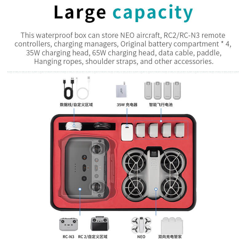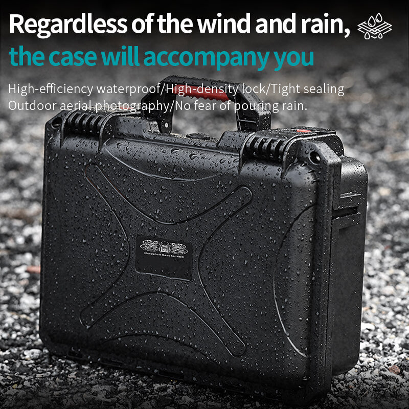 Dieser stabile Koffer bietet passgenaue Ausschnitte für die DJI Neo Drohne, Fernsteuerung, Zusatzakkus, Ladestation und USB Ladegerät.