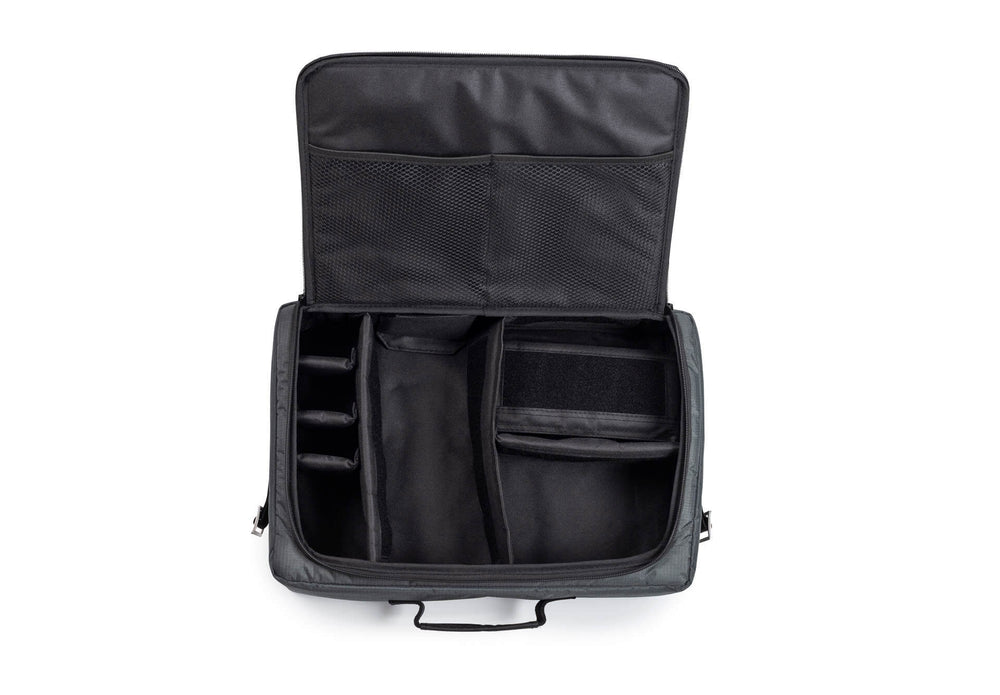 Dank der variablen Facheinteilung lässt sich der Innenraum flexibel an Ihr Equipment anpassen. Die beiden Netztaschen sowie das Frontfach auf der Außenseite bieten zusätzlichen Platz für Zubehör wie Akkus, Kabel oder Fernbedienungen.